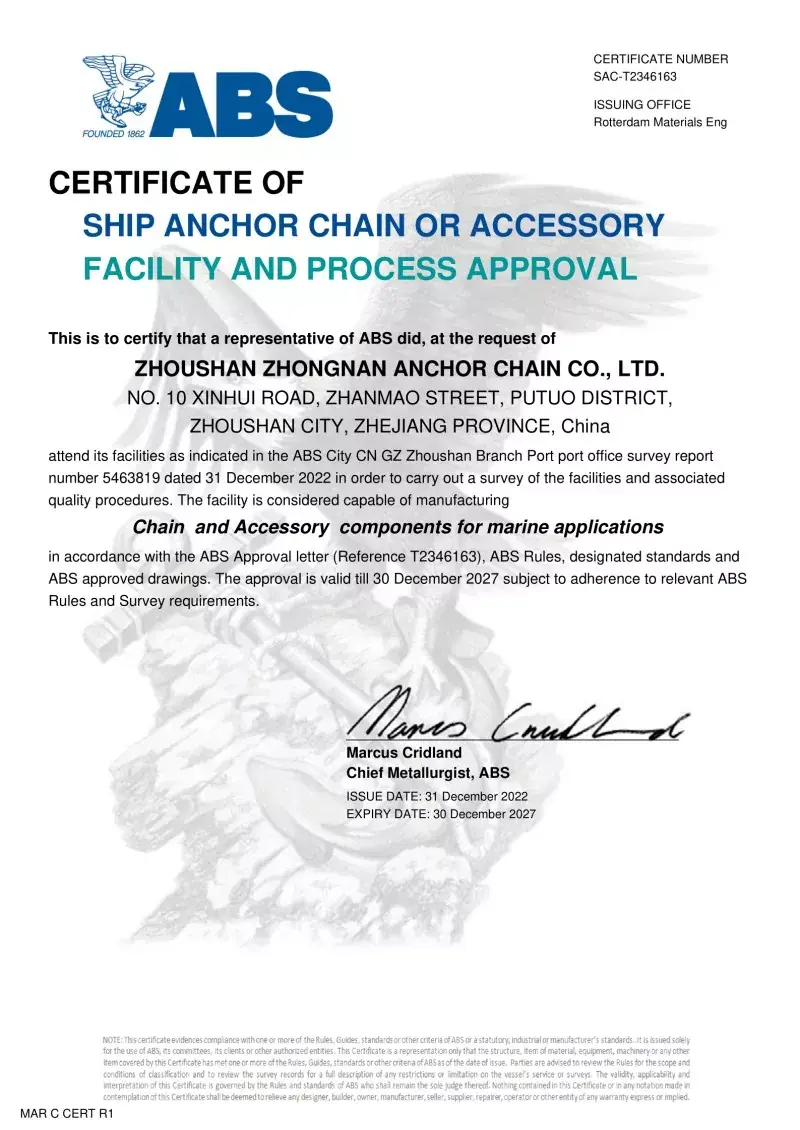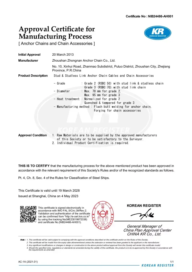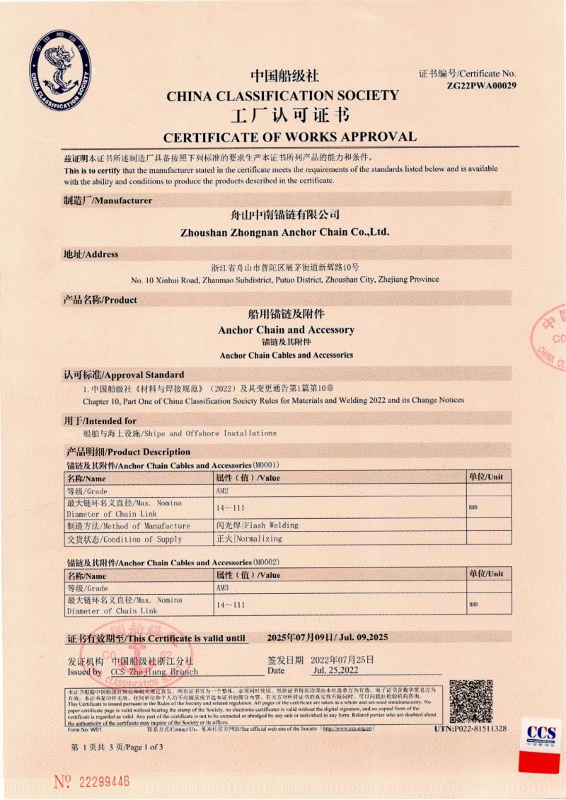 Ya. Semua aksesoris rantai jangkar kami diproduksi sesuai dengan standar internasional yang sama yang berlaku untuk rantai jangkar itu sendiri (ISO, IAC), termasuk persetujuan dari CCS, ABS, DNV, LR, BV, NK, KR, Rina, dan Rs. Sertifikasi ini memastikan bahwa aksesori memenuhi persyaratan untuk akurasi dimensi, keamanan, dan kekuatan mekanik yang ditetapkan oleh pembuat kapal global dan operator lepas pantai.