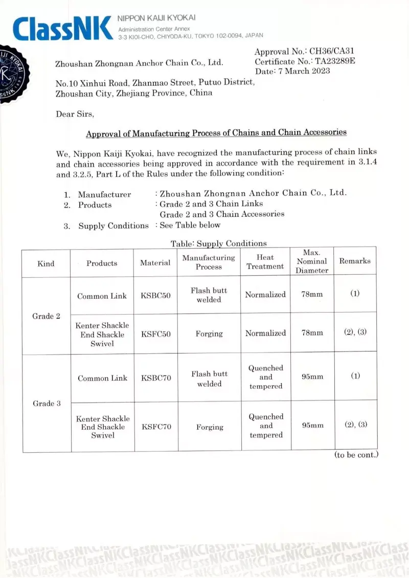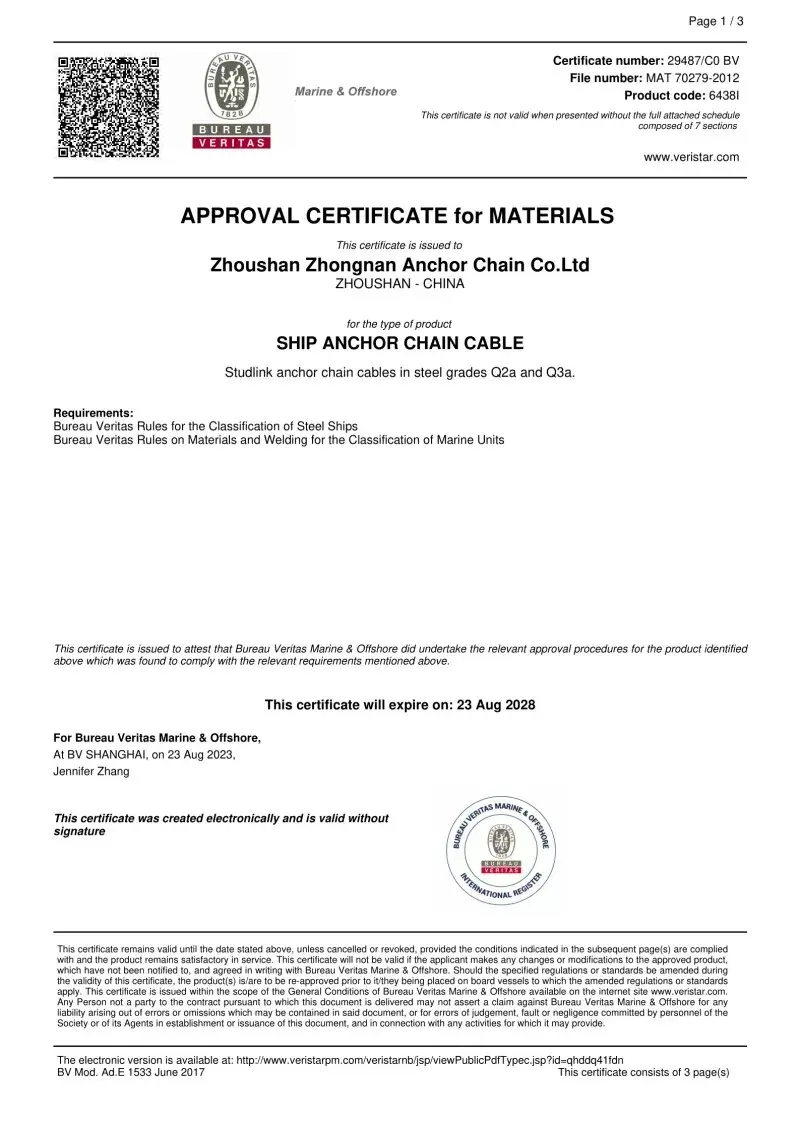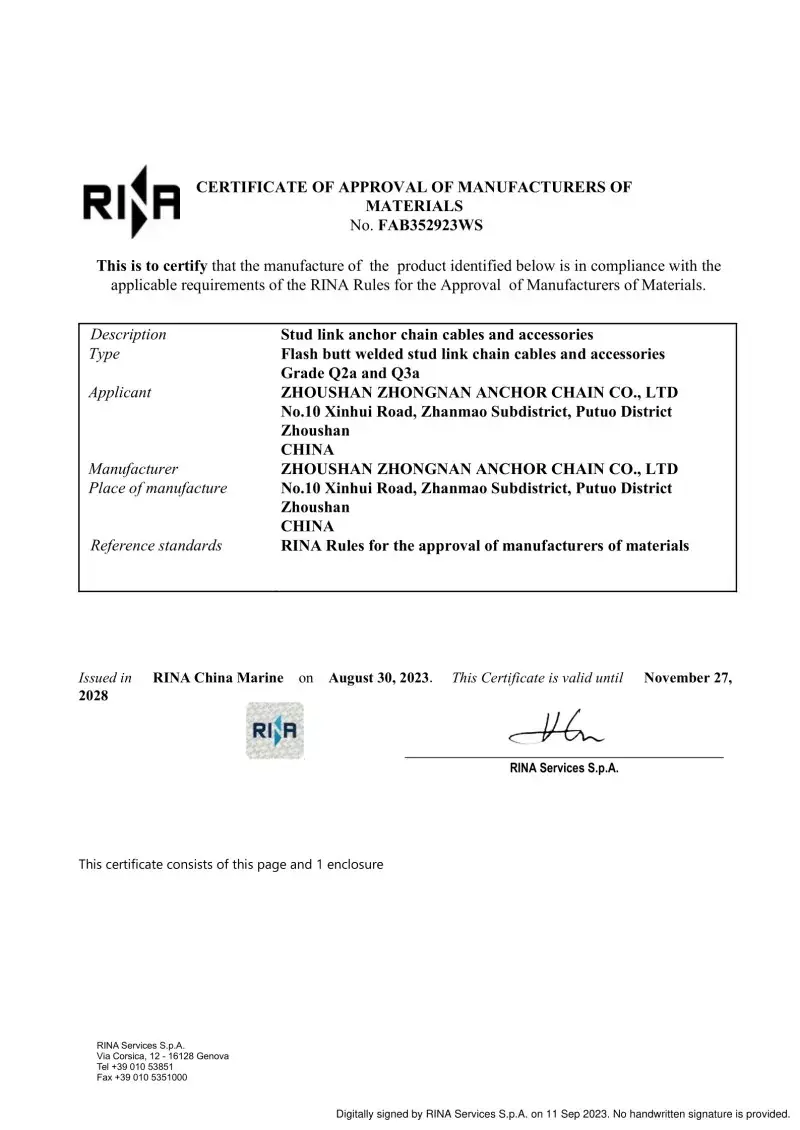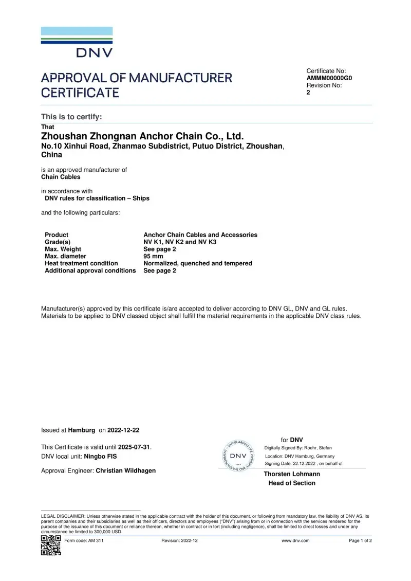 Ya. Semua aksesoris rantai jangkar kami diproduksi sesuai dengan standar internasional yang sama yang berlaku untuk rantai jangkar itu sendiri (ISO, IAC), termasuk persetujuan dari CCS, ABS, DNV, LR, BV, NK, KR, Rina, dan Rs. Sertifikasi ini memastikan bahwa aksesori memenuhi persyaratan untuk akurasi dimensi, keamanan, dan kekuatan mekanik yang ditetapkan oleh pembuat kapal global dan operator lepas pantai.